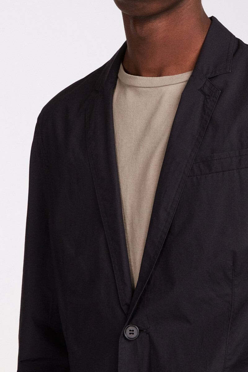 Wool & Cotton Jacket in a minimalistic one-side crop line with leather details on the pocket and the collar.