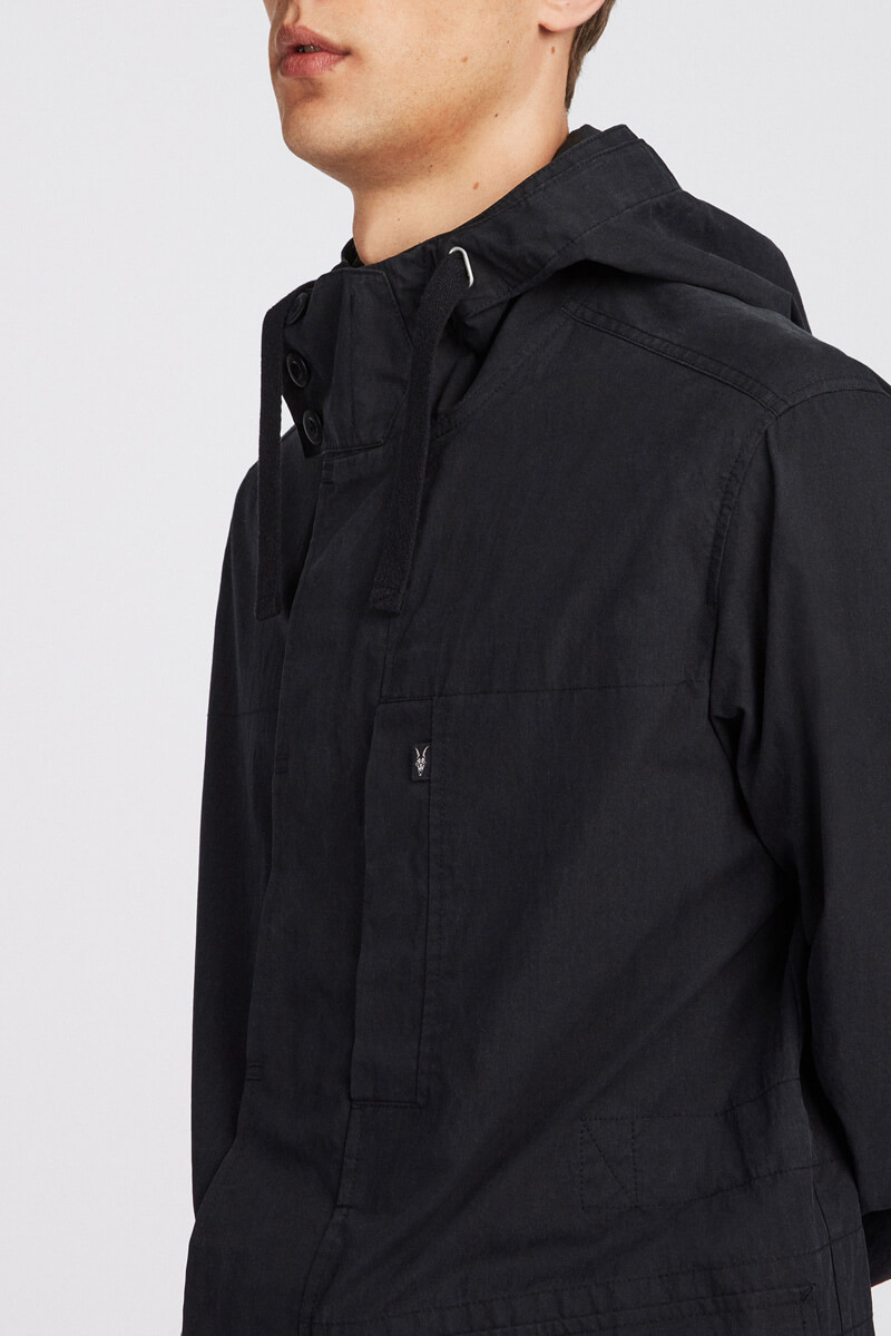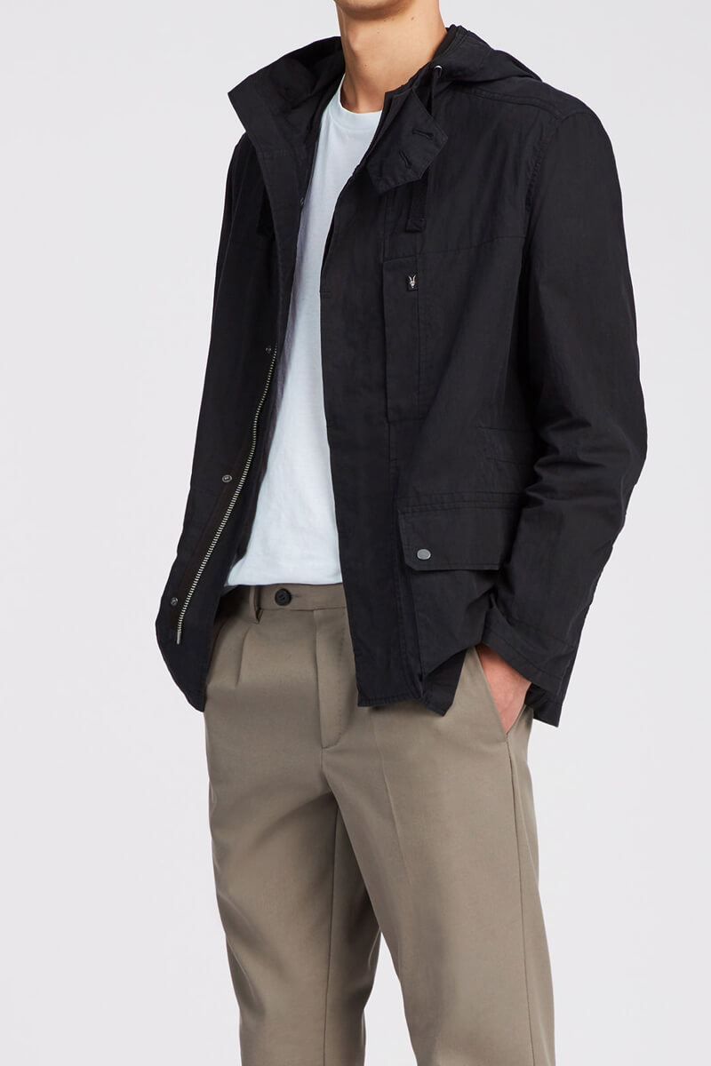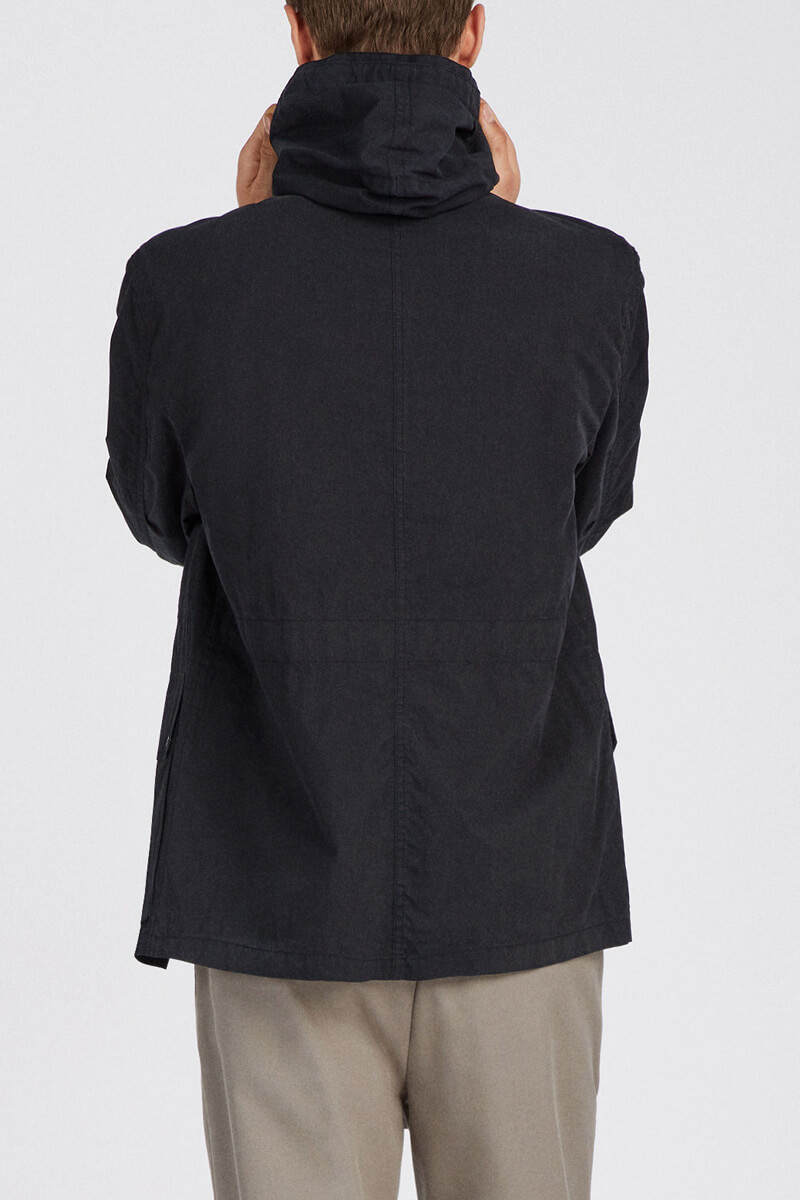 Wool & Cotton Jacket in a minimalistic one-side crop line with leather details on the pocket and the collar.